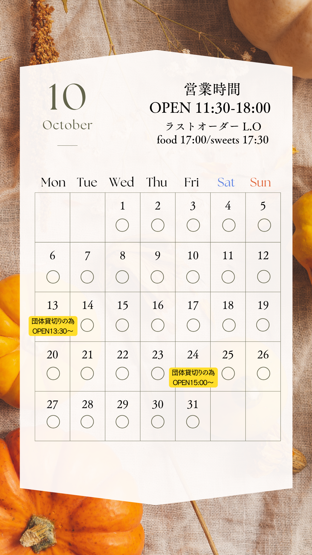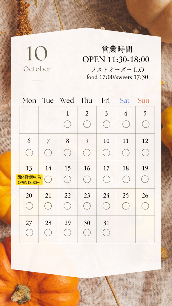10月の営業スケジュール NEWS 2025.10.01 日頃のご愛顧誠にありがとうございます。 10月のカフェ営業のスケジュールです。 皆様のご来店を心よりお待ちしております。 《カフェ営業時間》 OPEN 11:30-18:00 ラストオーダー L.O food 17:00 / sweets 17:30